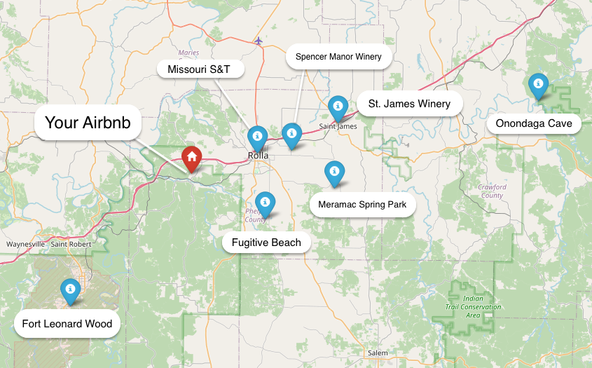 Welcome to the beautiful surroundings of Prairie Base! Nestled between Rolla and St. James near I-44, our location offers a perfect blend of rural charm and convenient access to a variety of attractions. This makes us a great spot to stay over while traveling, a quiet destination for some extended relaxation, or feel free to contact us about staying longer as needed.